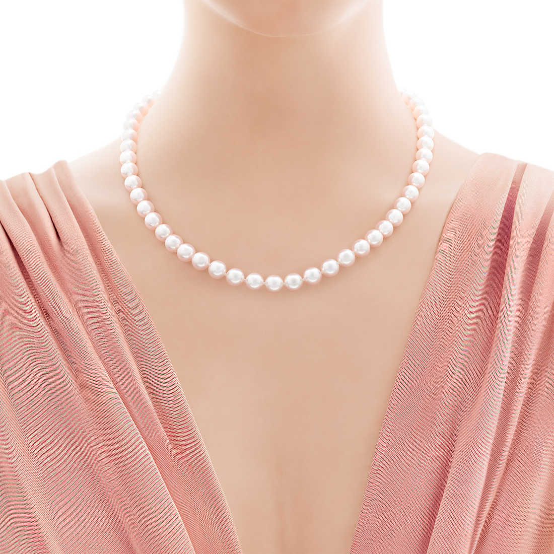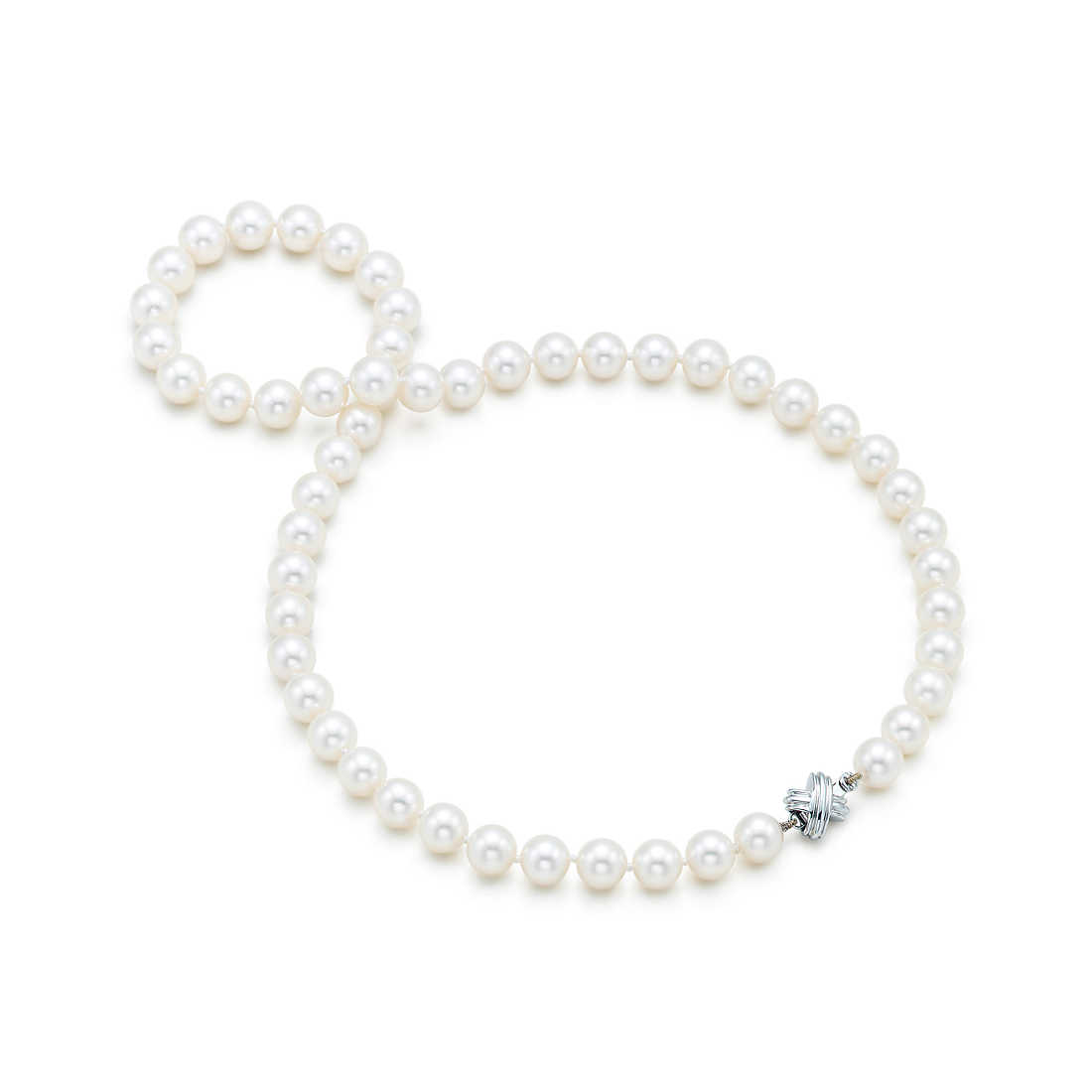 Necklace of Akoya cultured pearls with an 18k white gold double-sided clasp. 18″ long. Pearls, 7.5-8 mm.