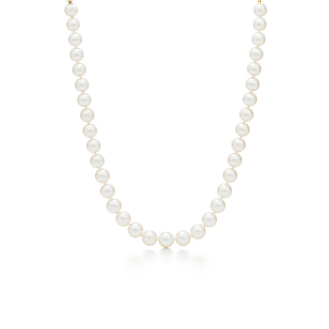 Necklace of South Sea cultured pearls with an 18k gold clasp. 18″ long. Pearls, 11-12.5 mm.