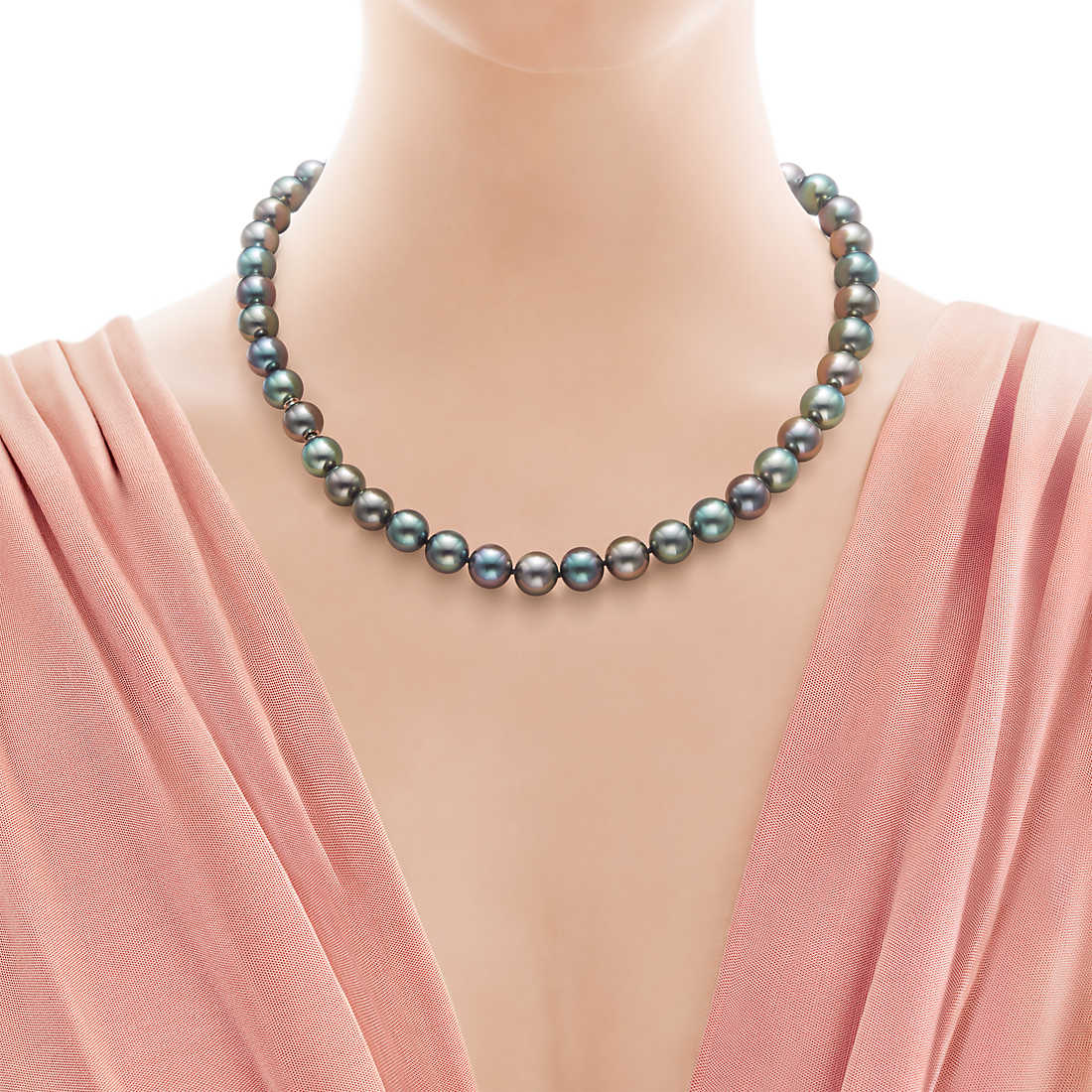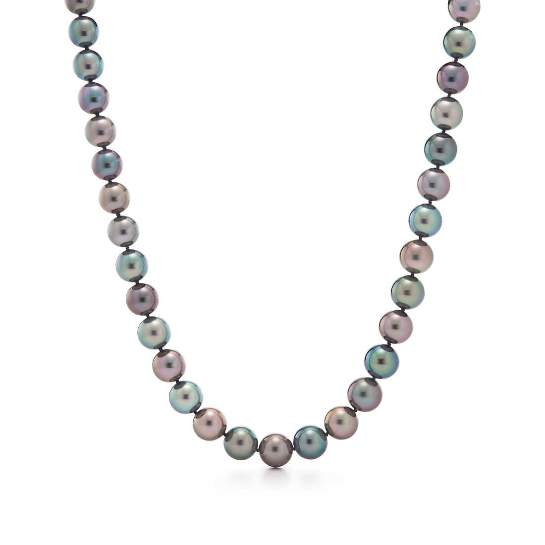 Of multicoloured Tahitian pearls with 18k white gold. 18″ long. Pearls, 9-11 mm.