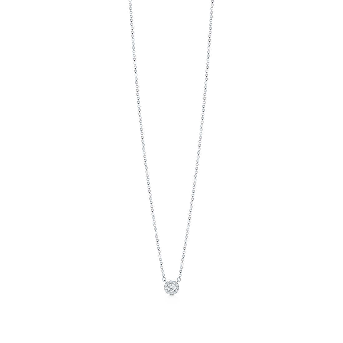 Pendant in platinum with round brilliant diamonds. 3.2 mm diameter. On a 16″ chain. Carat total weight .16.