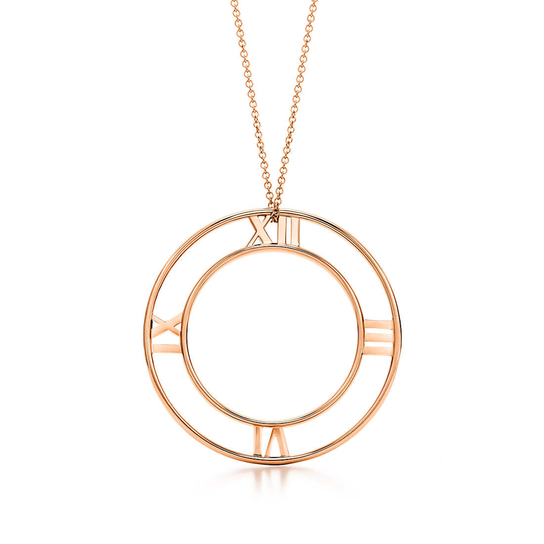 With its bold numeric motif and strong, sleek lines, this collection honours one of Tiffany’s most celebrated symbols. Pendant in 18k rose gold. Size large, on a 24″ chain.