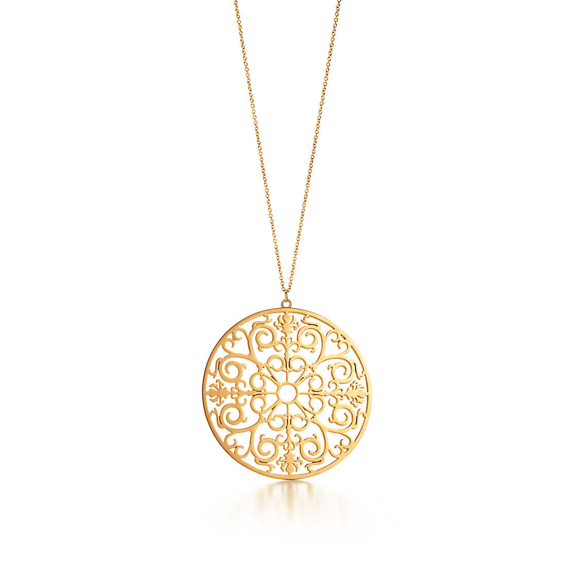 The fanciful scrolls of this design are based on 19th-century iron gates. Pendant in 18k gold. Size extra large, on a 30″ chain.