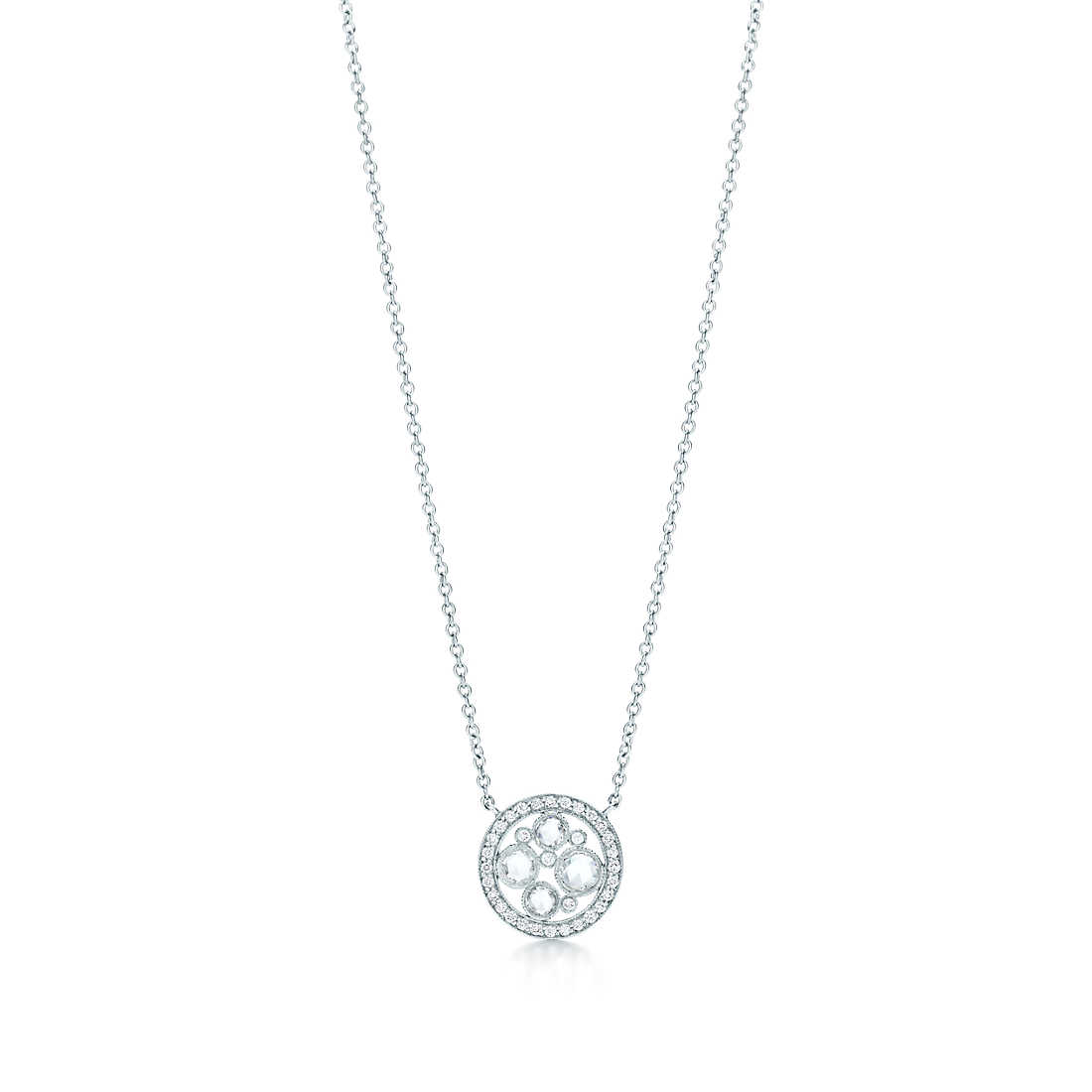Exquisite diamonds in a variety of sizes and cuts are snugly set together in a precious path of dazzling cobblestones. Pendant in platinum with rose-cut and round brilliant diamonds. On a 16″ chain. Rose-cut diamonds, carat total weight .19; round brilliant diamonds, carat total weight .07.
