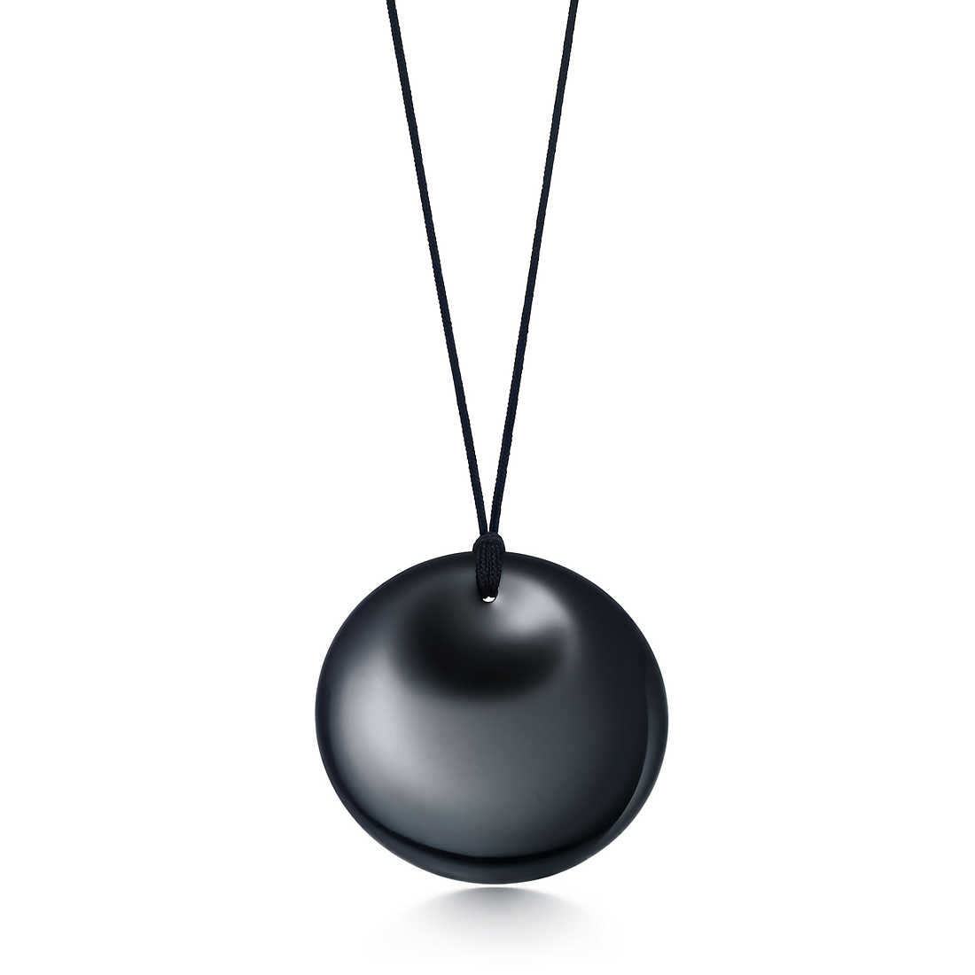 Sculpted to a sensual perfection, this seminal form retains its mysterious allure for all time. Pendant in black lacquer. On an 18″ black silk cord. Original designs copyrighted by Elsa Peretti.
