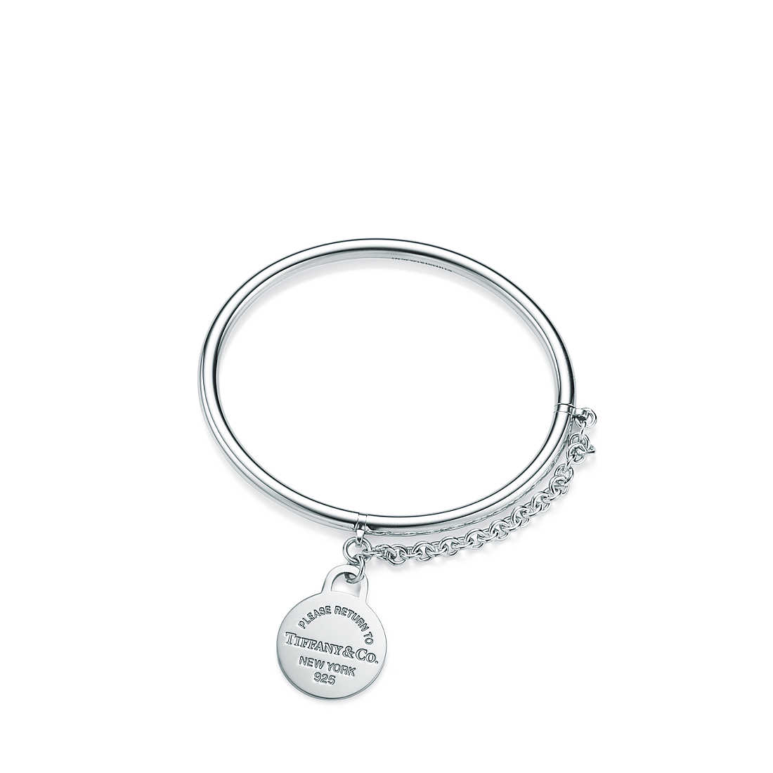 Inspired by the iconic key ring first introduced in 1969, the Return to Tiffany collectsion is a classic reinvented. An added chain and engraved tag emphasize this bangle’s stunning and sophisticated design.