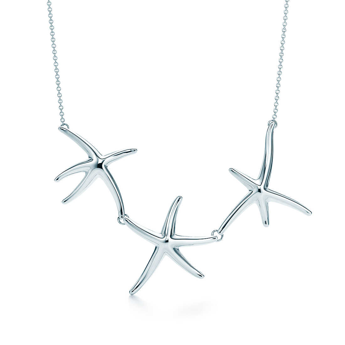 The starfish evokes life beneath the waves and in the celestial heavens. Necklace in sterling silver. 17″ long. Original designs copyrighted by Elsa Peretti.