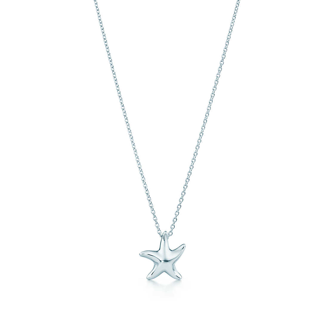 The starfish evokes life beneath the waves and in the celestial heavens. Pendant in sterling silver. On a 16″ chain. Original designs copyrighted by Elsa Peretti.