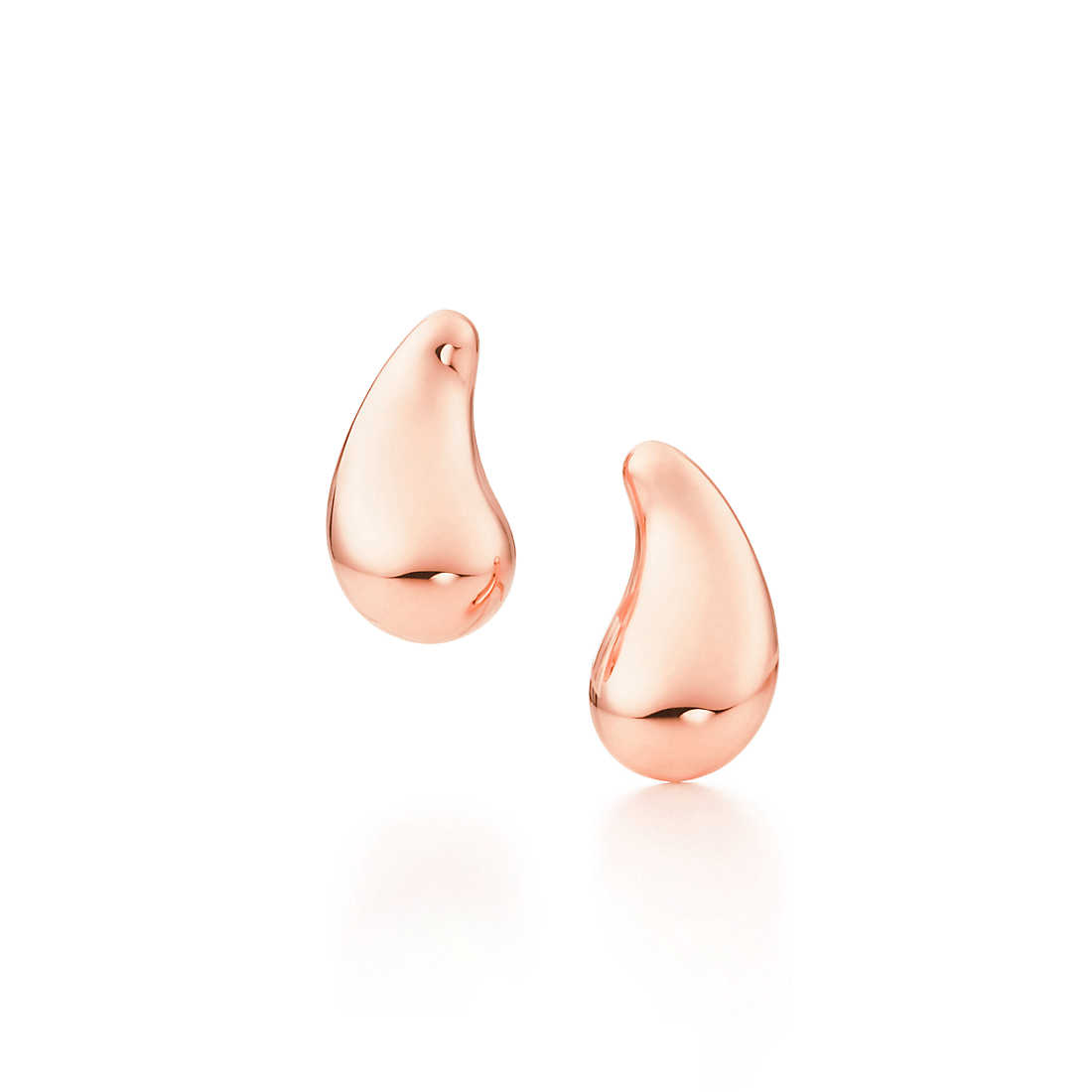 Reminiscent of a solitary raindrop or a shining bead of morning dew. Earrings in 18k rose gold, for pierced ears. Teardrops, 10 mm long each. Original designs copyrighted by Elsa Peretti.