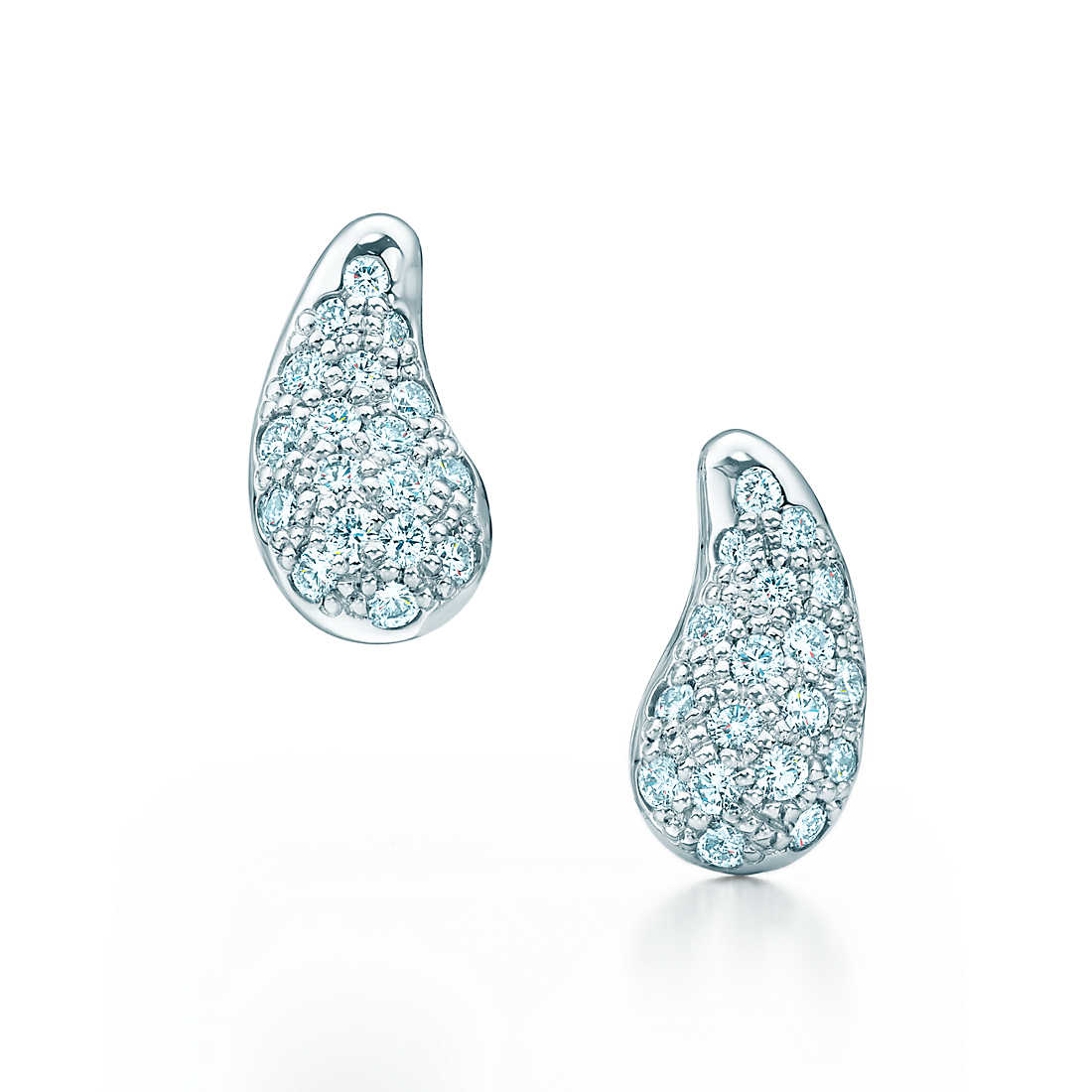 Reminiscent of a solitary raindrop or a shining bead of morning dew. Earrings in platinum with pavé diamonds. Carat total weight .30. Original designs copyrighted by Elsa Peretti.