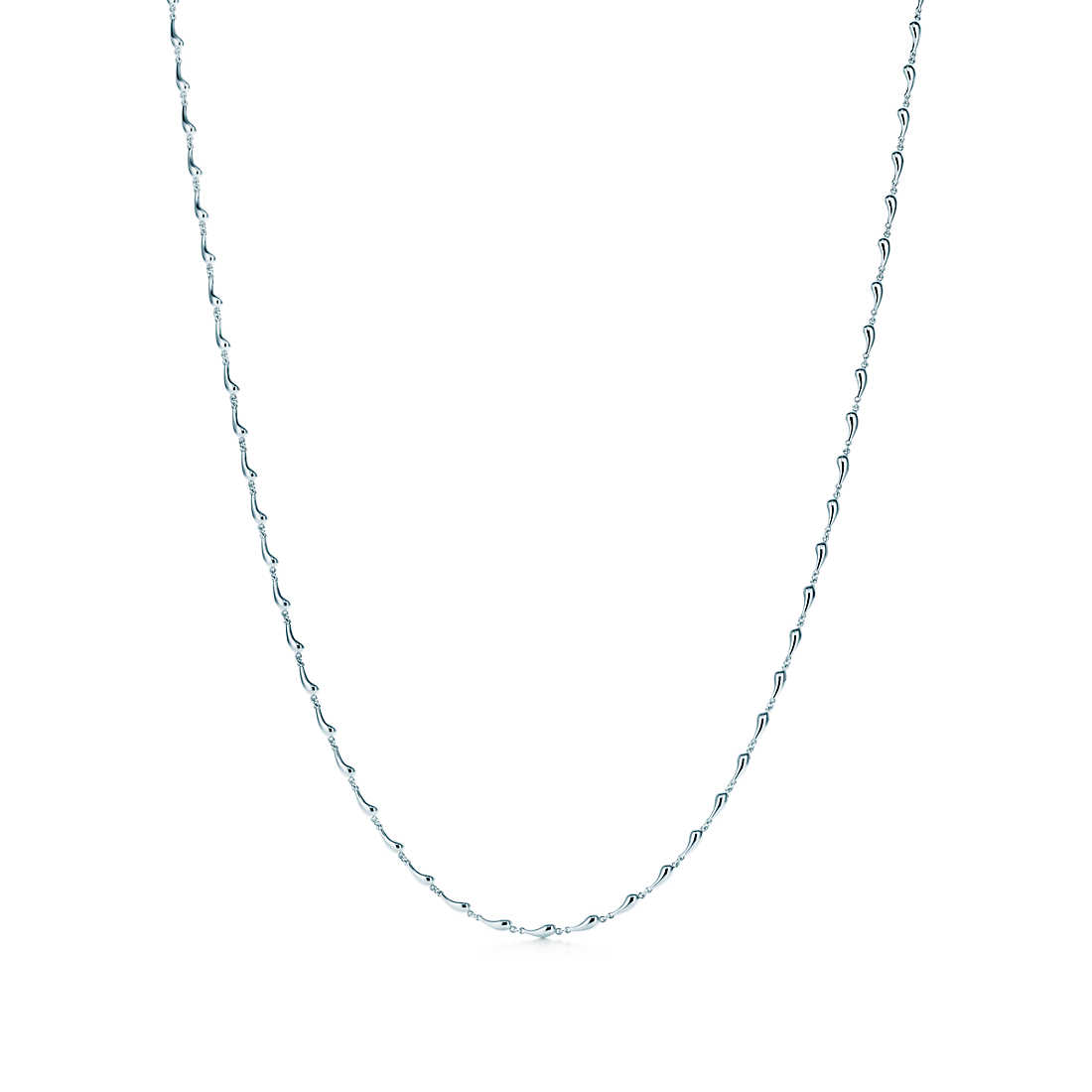 Reminiscent of a solitary raindrop or a shining bead of morning dew. Continuous necklace in sterling silver. 38″ long. Original designs copyrighted by Elsa Peretti.