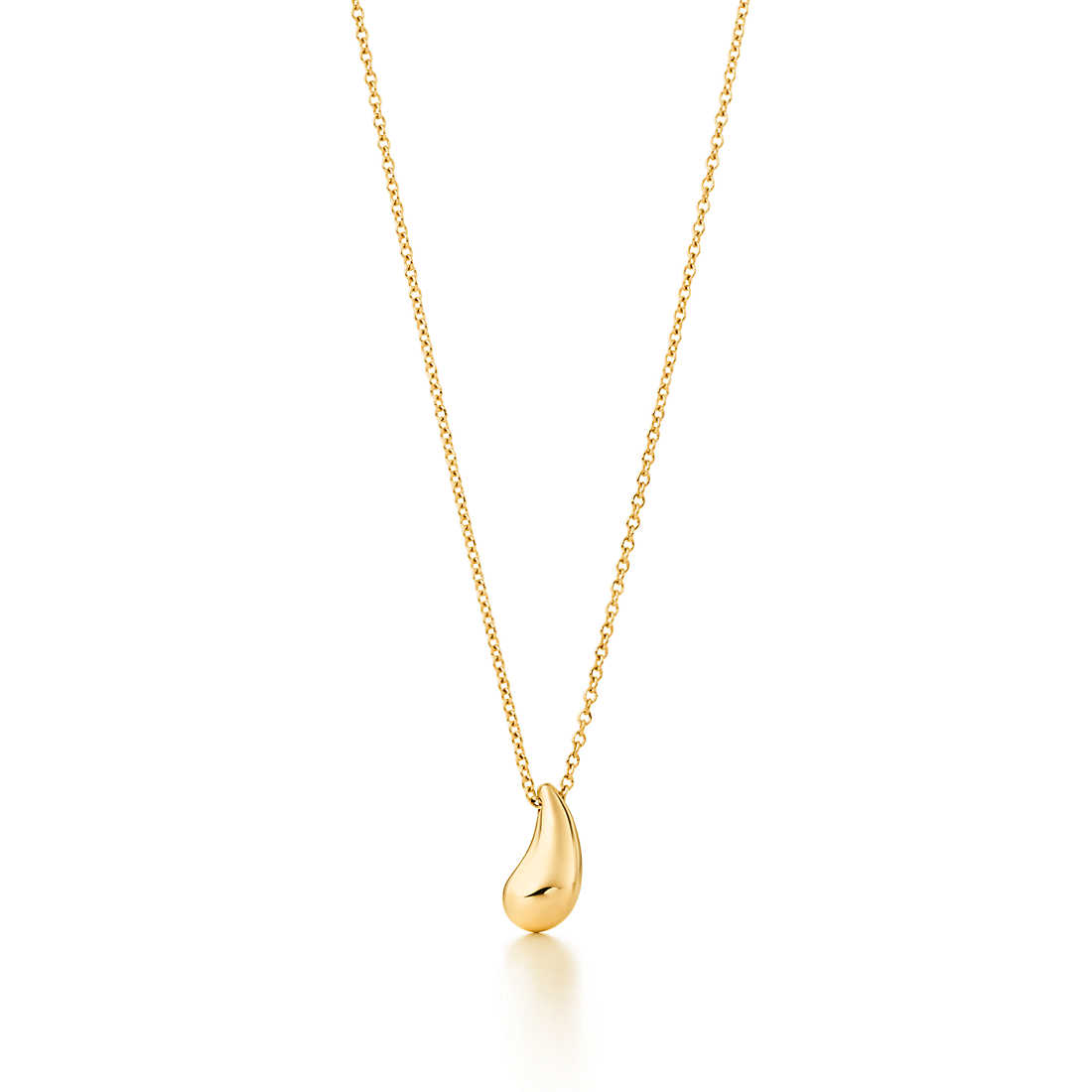 Reminiscent of a solitary raindrop or a shining bead of morning dew. Pendant in 18k gold. On a 16″ chain. Teardrop, 12 mm long. Original designs copyrighted by Elsa Peretti.