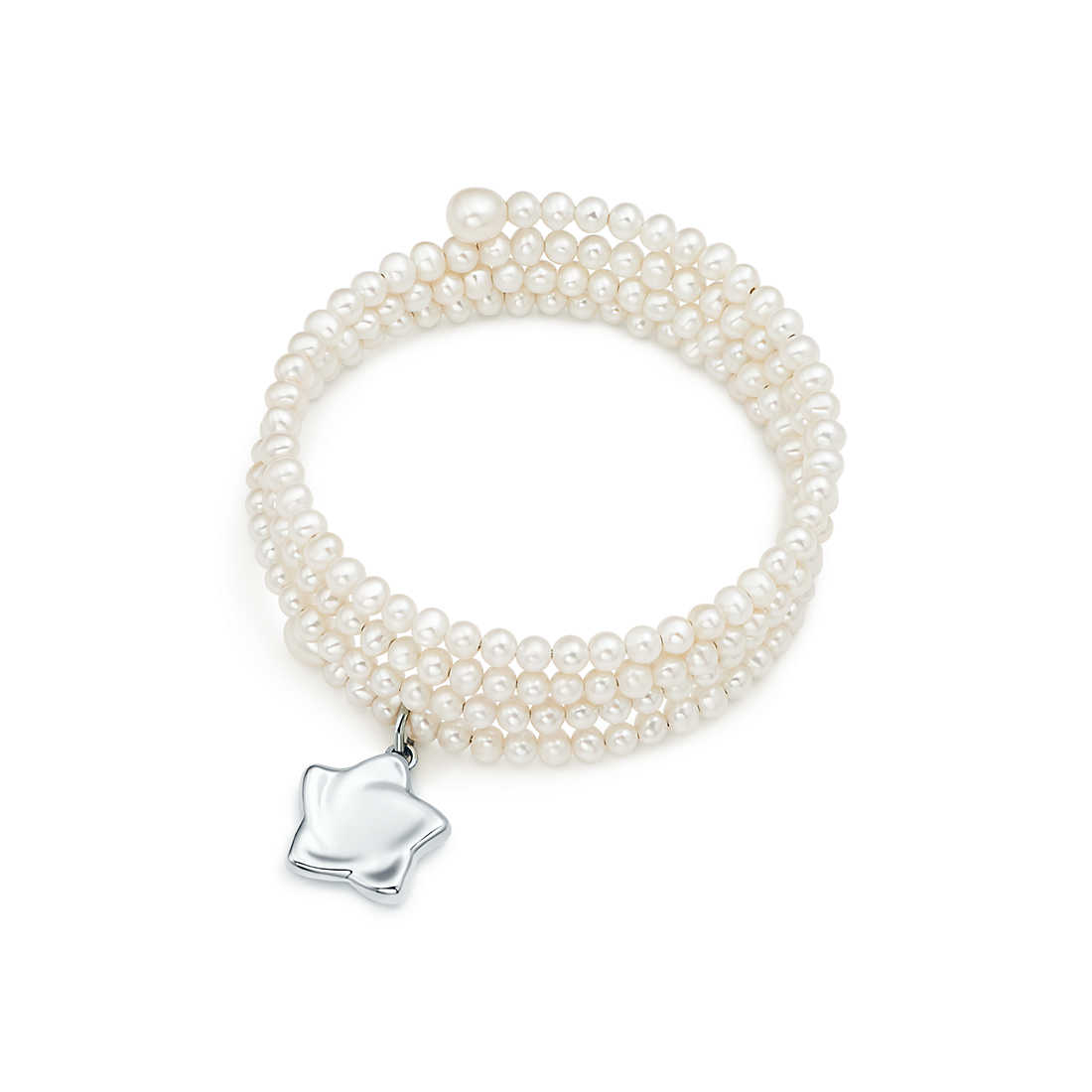 Three-row freshwater pearl bracelet with sterling silver star charm. Size medium, fits wrists up to 6.25″. Pearls, 3.5-4 mm. Original designs copyrighted by Elsa Peretti.