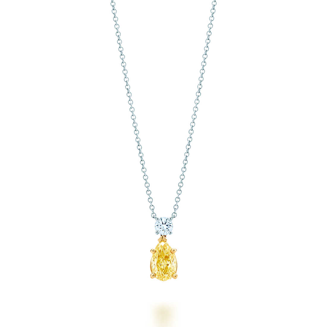 A round brilliant white diamond accents a Tiffany Yellow Diamond chosen for its remarkable color and size. Pendant in platinum and 18k gold. On a 16″ chain. Price may vary depending on color, carat weight and availability.