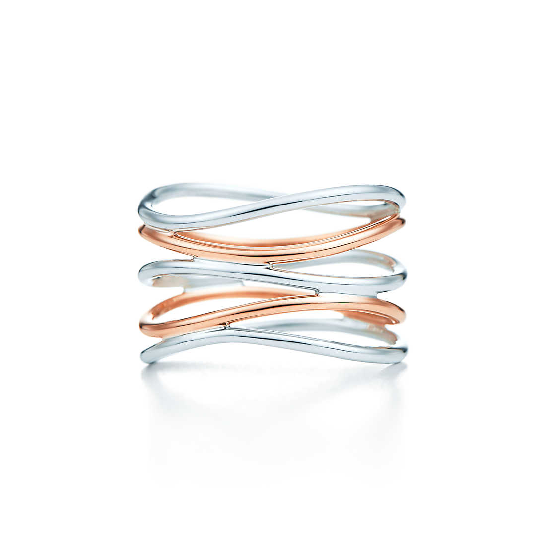 The wave seduces the eye and soothes the spirit. Ring in sterling silver and 18k rose gold. Original designs copyrighted by Elsa Peretti.