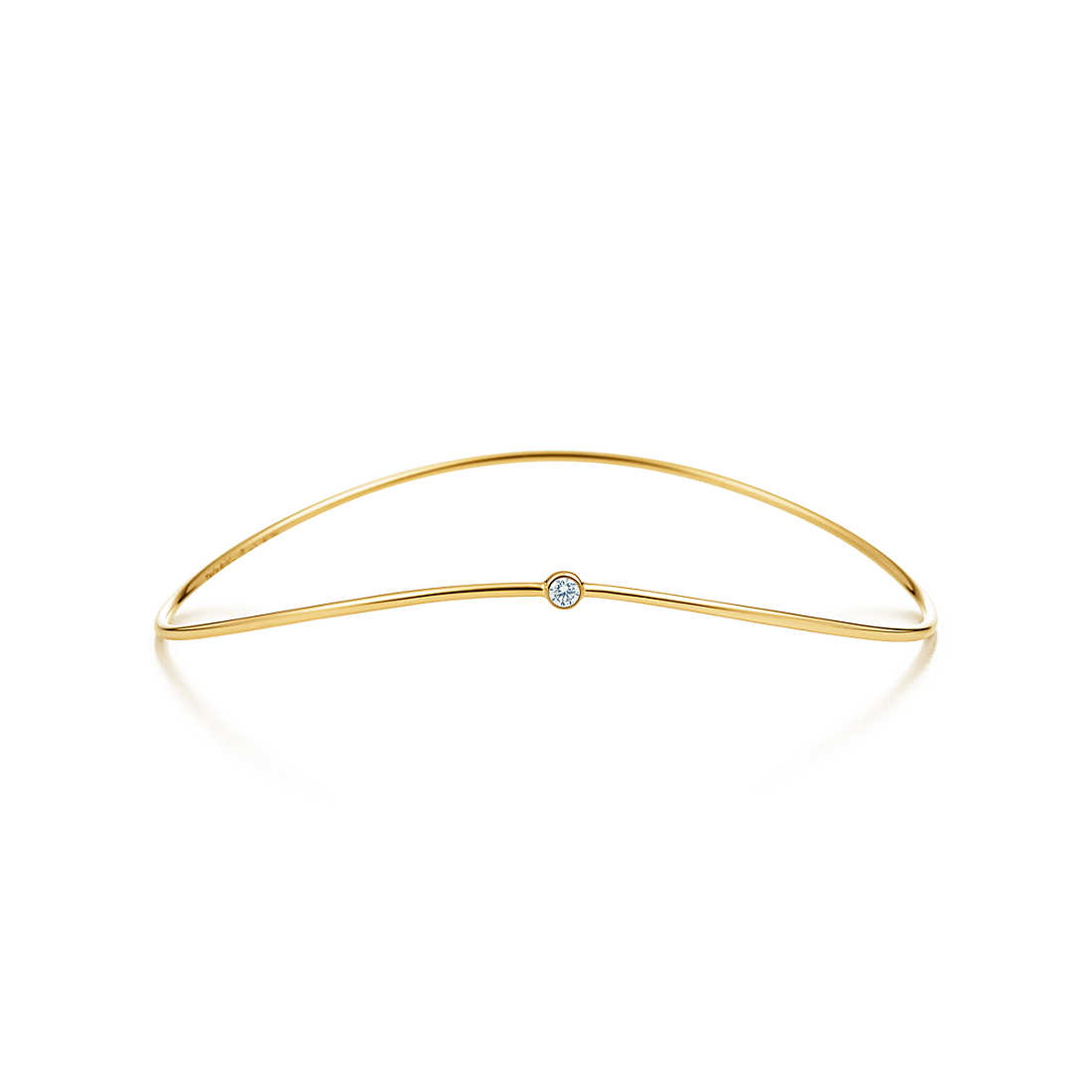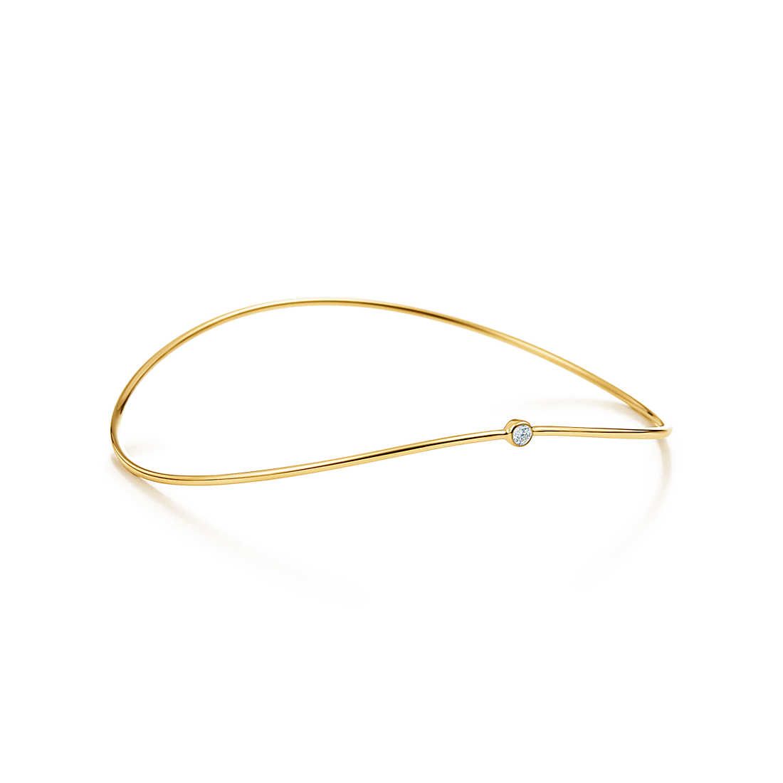 The wave seduces the eye and soothes the spirit. Bangle in 18k gold with a round brilliant diamond. Size medium, fits wrists up to 6.25″ in circumference. Carat weight .05. Original designs copyrighted by Elsa Peretti.