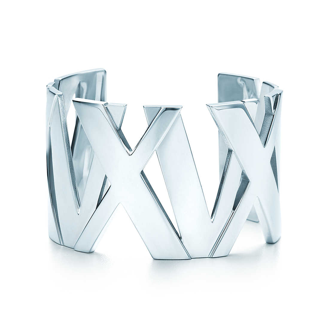 Strong lines meet striking numerals in a contemporary design that honours a Tiffany icon. Cuff in sterling silver. Size small.