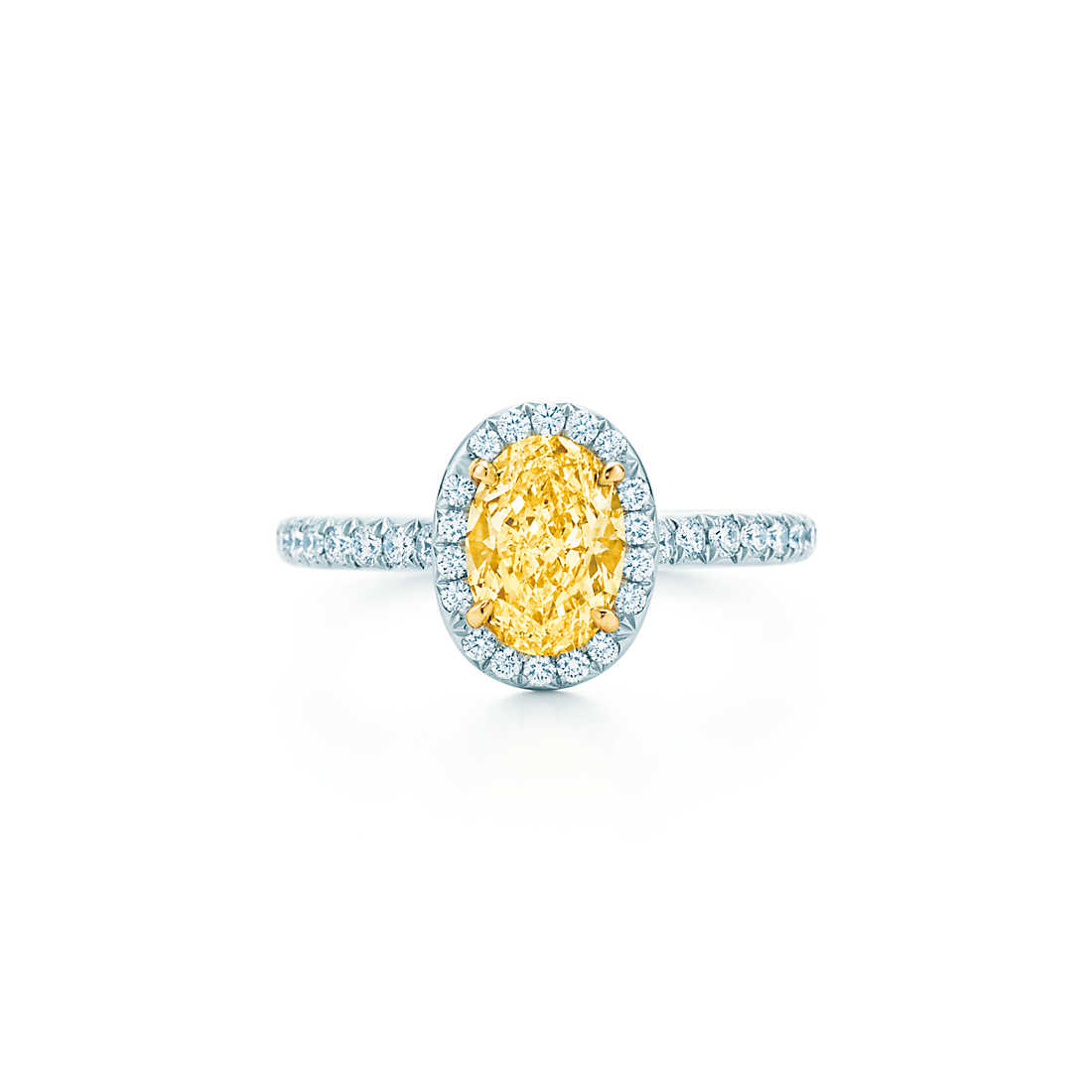 A riveting oval Tiffany Yellow Diamond smoulders with the intensity of sunlight. Ring in platinum and 18k gold. Size 6. Price may vary depending on colour, carat weight and availability.